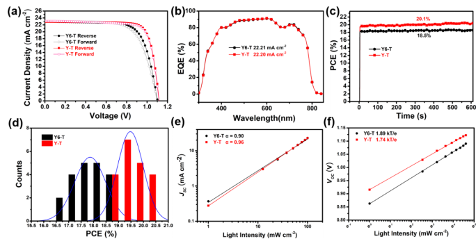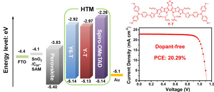 研究者在n-i-p结构的PSCs中,分别将Y6-T和Y-T作为非掺杂HTM材料,器件结构为FTO/SnO2/C60-SAM/MA0.7FA0.3PbI3/PEAI/HTM/Au。基于非掺杂的Y6-T器件效率为18.82%,其中开路电压(VOC)为1.108 V,短路电流(JSC)为22.90 mA cm-2,填充因子(FF)为74.18%,比掺杂的spiro-OMeTAD器件效率(19.24%)略低。令人惊奇的是,基于非掺杂的Y-T器件效率达到20.29%,其中VOC为1.118 V,JSC为22.90 mA cm-2,填充因子(FF)为79.25%。