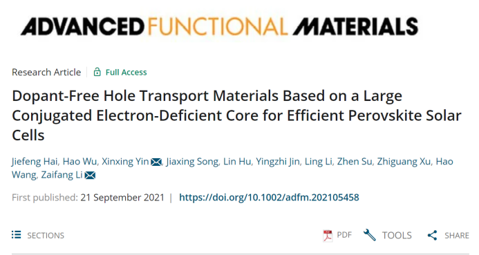 目前有机/无机杂化钙钛矿太阳能电池(PSCs)发展迅猛,其光电转化效率(PCE)已经突破了25%。空穴传输材料(HTMs)作为钙钛矿太阳能电池的重要组成部分之一,对器件的效率、稳定性以及大规模应用具有至关重要的影响。目前高效率的PSCs通常选用成本昂贵的spiro-OMeTAD作为空穴传输层,但是spiro-OMeTAD需要采用锂盐、钴盐、叔丁基吡啶等掺杂剂来提升其迁移率和导电性,这些亲水分子会降低电池的长期稳定性,因此低成本非掺杂空穴传输材料的开发对于高效稳定PSCs的商业化非常重要。