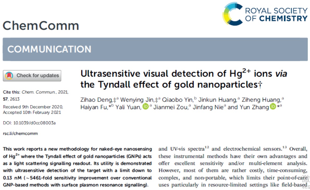 张云教授和中南民族大学付海燕教授合作,以纳米金为模型胶体体系,首次发展了一种基于TE的高毒害性Hg2+离子高灵敏POCT可视化检测新方法。纳米金经自组装修饰Tween-20后可在高浓度盐溶液中稳定单分散。当样品中存在靶标离子时,该稳定剂分子将因胶体探针表面形成Hg-Au合金而脱落;后者随即发生团聚并生成更大尺寸的复合物,最终导致反应溶液的TE明显增强。研究结果表明,新方法仅需使用一只激光笔(作为手持式光源)和一台智能手机(用于TE成像)即可测定浓度低至0.13 nM的Hg2+离子,比基于表面等离子体共振原理且依赖大型光学仪器的传统比色分析策略的检测灵敏度显著提高了5400倍以上。