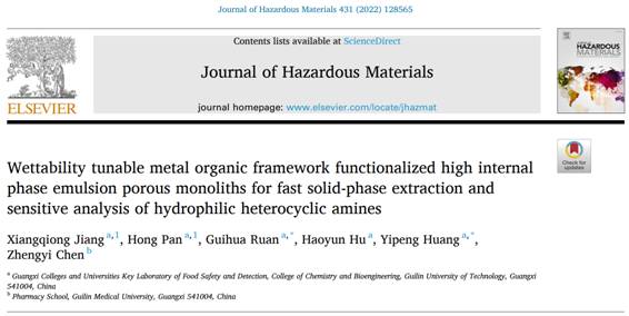 阮贵华研究员课题组在多孔聚合物材料的制备及其应用研究领域再次取得重要进展。团队研究成果以题为Wettability tunable metal organic framework functionalized high internal phase emulsion porous monoliths for fast solid-phase extraction and sensitive analysis of hydrophilic heterocyclic amines的论文被环境科学与生态学类国际知名期刊Journal of Hazardous Materials(IF=10.588)录用并正式发表。该项研究得到国家自然科学基金以及广西自然科学基金等多个项目的资助,工口漫画