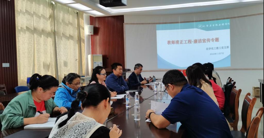 为引导教师规范言行,加强教师思政建设,营造优良党风、清正教风,2022年11月7日,化学与化工教工党支部在12217举行了“教师清正工程”廉洁宣传主题党日活动。