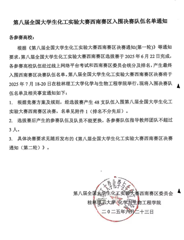 导航痕迹 当前位置: 主页 >> 教育教学 >> 第八届全国大学生化工实验大赛西南赛区专栏 >> 正文 第八届全国大学生化工实验大赛西南赛区入围决赛队伍名单通知 【 发布日期:2025-06-24 浏览次数: 】 上一条:第八届“中控杯”全国大学生化工实验大赛西南赛区决赛通知 (第三轮)